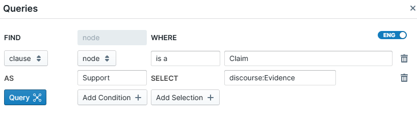 The query drawer component allows you to construct structured queries over your discourse graph, based on discourse relations (e.g., "find all evidence that supports/opposes a claim"), and reason over the results in a structured, tabular format (e.g., "find all evidence that supports a claim, and allow me to filter/sort by methodological details").